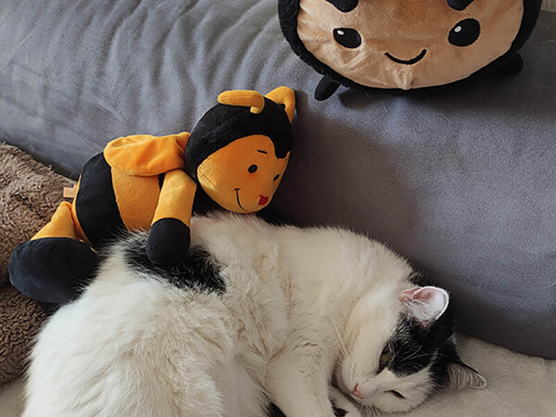Wir sind die Bienenklasse. Im Moment sind wir 24 Kinder. Frau Dee ist unsere Klassenlehrerin. Unsere Klassentiere sind natürlich auch Bienen und heißen Bella und Bob. Sie fliegen jedes Wochenende mit einem anderen Kind mit und erleben tolle Abenteuer. Auf dem Bild kuscheln sie mit Frau Dees Katze Mia.